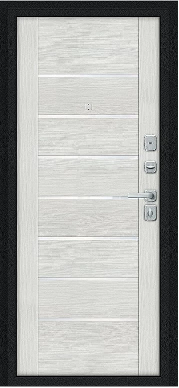 Надежная входная Дверь Браво Техно/BChrome Букле черное/Bianco Melinga премиум класса по цене 35 551 руб. Большая толщина стали защитит от проникновения в ваш дом, квартиру или коттедж. Используется очень качественная фурнитура: замки, цилиндры, ручки, защелки. Покрытие и отделка двери изготовлено под внимательным контролем производителя. Дверь имеет долгий срок службы и гарантию.